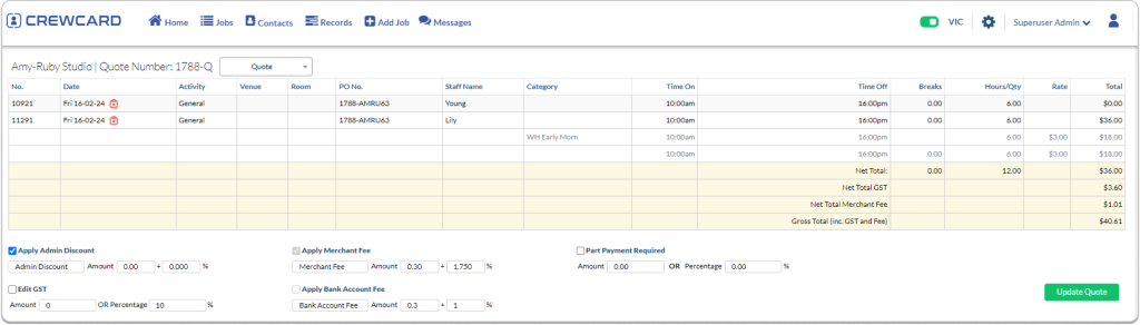 Quote: Before sending a quote, please read 10.2.13 Quote Template Settings to set up a customised quote experience on CrewCard.
