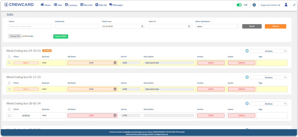 The ‘Jobs’ page displays Job Sheets, Quotes and Invoices for jobs based on the week that they are booked. New jobs in the system are automatically shown here. The default week is Monday to Sunday. If you would like to alter this, please contact support@personnelmanager.com.