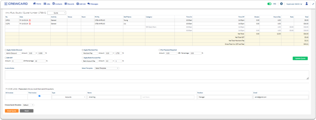 When it is time to send the quote, select a Quote Template of either CrewCards default template, or your own customised one that you are able to set up in settings. Finally, click Email Quote.