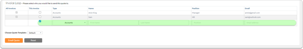 After reviewing the quote, move down to the Invoice Loop section. All recipients who have been uploaded into the client’s profile will be displayed here. To find out how to do this, please see guide 9.2 Client Profile. Tick the box next to their name. If you wish to send the quote to a recipient who is not in the system, use the bottom line to add their information: