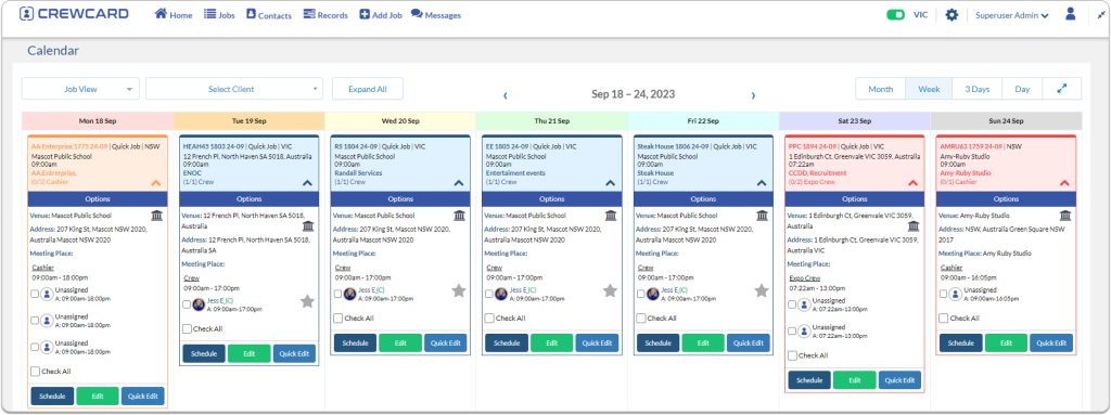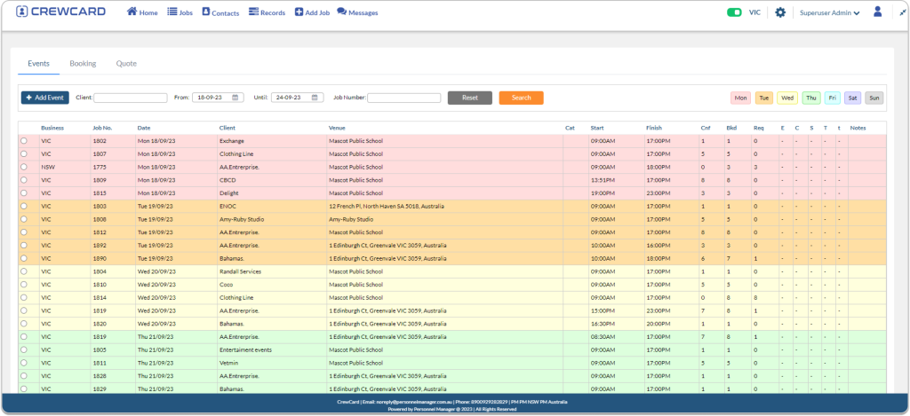 Working on the Events page is a different way of entering jobs, paying staff and charging clients. The layout of the page shows an overview of all jobs in colour coordination, based by the day of the week. Please view guide 4.7 to learn more.