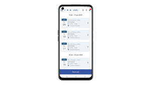Each shift is shown on individual cards featuring a calendar-like date, job details, and clear status indicators such as “Active”, “Booked”, or “Locked”.