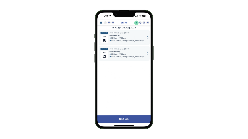 When you first open the app you will be taken to the Shifts Page. This is quick access to your shifts.