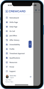 In order to view Available Jobs/ Shifts, login to the CrewCard app and select the hamburger icon in the top left corner. Once the pop out menu appears, select ‘Job Offers’. This will present the available shifts.