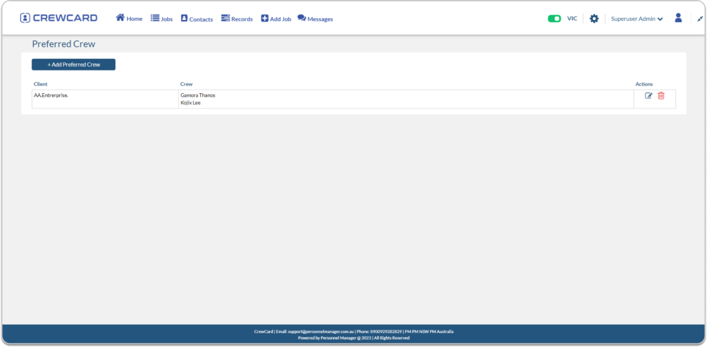 Within the preferred crew page, you have the option to either make modifications to your preferred crew selections or alternatively remove them by clicking the trash icon.