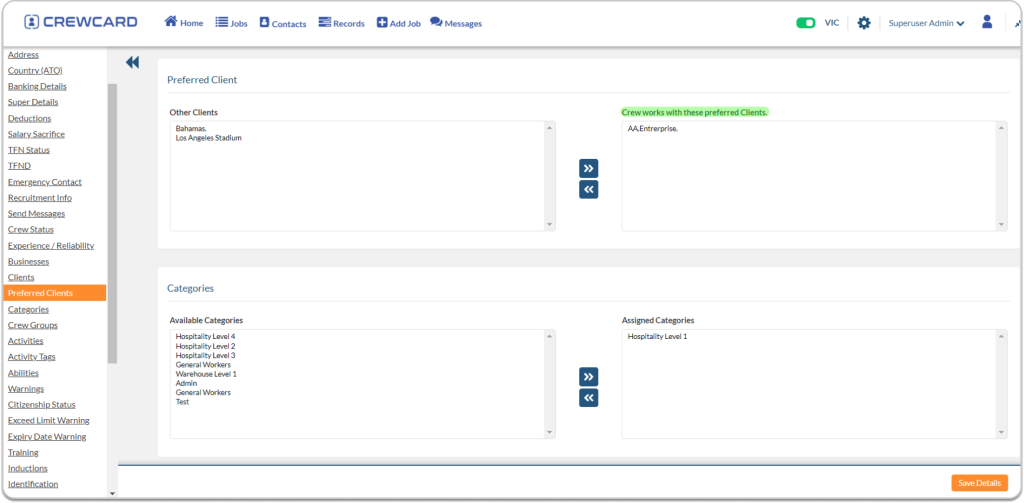 You will be taken to the preferred staff page, where you can designate the preferred crew members for the clients.